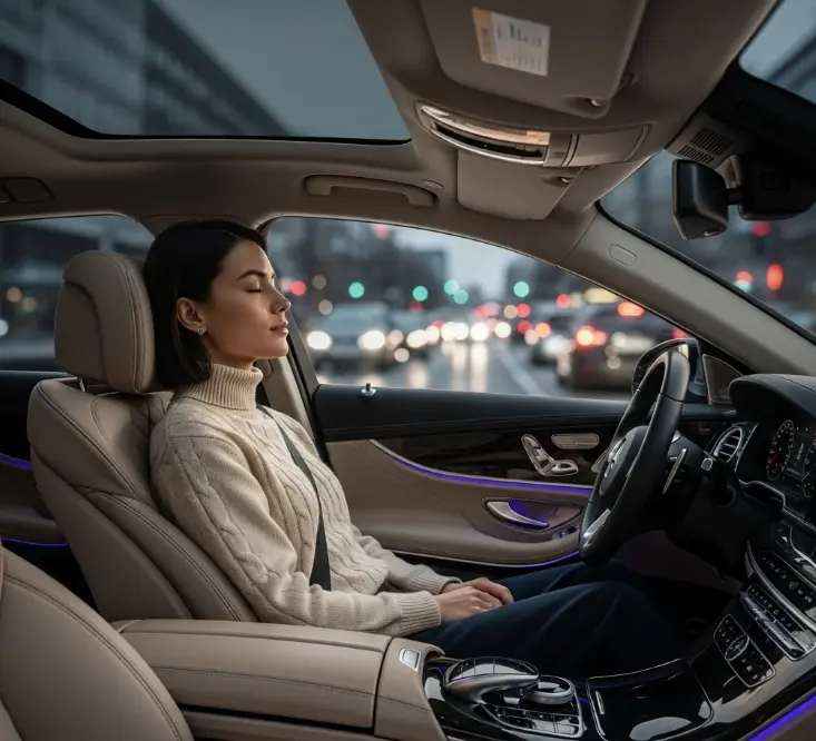 - برنامههای آرامبخش: اگر سیستم تشخیص دهد که شما استرس دارید یا خسته هستید، میتواند به صورت خودکار یک «برنامه آرامبخش» را فعال کند. این برنامه با ترکیب ماساژ ملایم صندلی، تغییر نورپردازی کابین به رنگ آبی آرامشبخش، پخش یک موسیقی بیکلام و آزاد کردن یک رایحه آرامبخش (مانند اسطوخودوس) از طریق سیستم تهویه، به بهبود حال روحی شما کمک میکند.